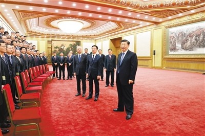 九月三十日,黨和國家領導人習近平、韓正等在北京人民大會堂會見C919大型客機項目團隊代表并參觀項目成果展覽。這是習近平等會見C919大型客機項目團隊代表。新華社記者丁林攝