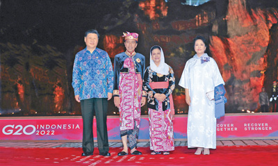 當(dāng)?shù)貢r(shí)間11月15日晚,國(guó)家主席習(xí)近平和夫人彭麗媛在印度尼西亞巴厘島出席二十國(guó)集團(tuán)領(lǐng)導(dǎo)人峰會(huì)歡迎晚宴。這是習(xí)近平主席夫婦在晚宴前同印度尼西亞總統(tǒng)佐科夫婦合影。新華社記者鞠鵬攝