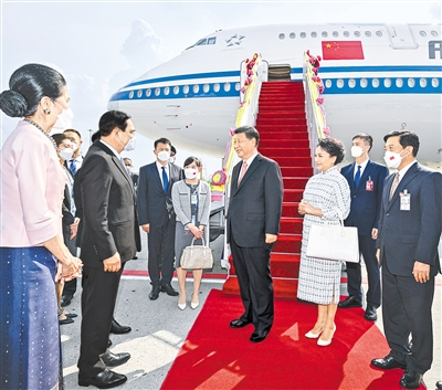 習(xí)近平和夫人彭麗媛乘坐的專機(jī)抵達(dá)曼谷素萬那普國際機(jī)場時,泰國總理巴育夫婦、副總理兼外長敦夫婦、文化部部長伊提蓬夫婦等熱情迎接。禮兵分列紅地毯兩側(cè),身著靚麗民族服裝的當(dāng)?shù)厍嗄晷泻鲜Y夾道歡迎,泰國華僑華人代表揮舞中泰兩國國旗,向習(xí)近平夫婦表示最熱烈的歡迎。