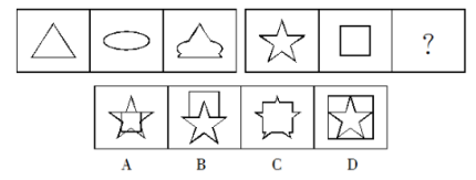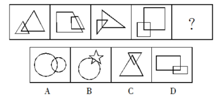 【答案】D【解析】已知的四個圖形都是存在相交,而選項也都是相交,故單純的看相交無法確定答案,對比四個圖發(fā)現(xiàn)每組兩個圖形相交部分都與兩個圖形形狀相同,故答案選D。