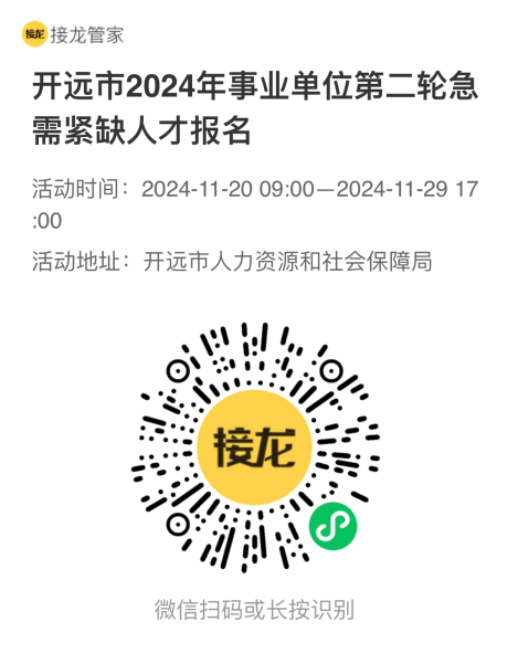 3.報(bào)名方式:本次實(shí)行網(wǎng)絡(luò)報(bào)名,應(yīng)聘人員掃描下方二維碼進(jìn)行報(bào)名,到報(bào)名截止時(shí)間未完成報(bào)名步驟和提供相應(yīng)材料的,視為放棄報(bào)名資格,報(bào)名過程中如遇到問題可聯(lián)系開遠(yuǎn)市人力資源和社會保障局事業(yè)單位管理科,聯(lián)系電話:0873-7236881,郵箱:kyrsjsyk@163.com。