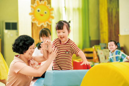 近年來(lái),各地著力解決3歲以下嬰幼兒家庭入托難、入托貴等問題,大力發(fā)展完善普惠托育服務(wù)體系,不斷增強(qiáng)人民群眾對(duì)普惠托育服務(wù)的獲得感和滿意度,促進(jìn)嬰幼兒健康成長(zhǎng)。圖為2024年9月4日,江西省奉新縣示范幼兒園托育班的老師和孩子們?cè)诳鞓返赝嫠?。人民圖片 周亮/攝