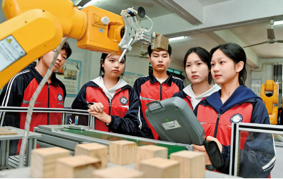 近年來(lái),各地加強(qiáng)人力資源開發(fā)利用,大力發(fā)展職業(yè)教育,針對(duì)性地培育人才市場(chǎng)需求的專業(yè)技術(shù)人才,促進(jìn)人口高質(zhì)量發(fā)展。圖為2024年10月29日,湖南省洞口縣雪峰博雅職業(yè)技術(shù)學(xué)校,學(xué)生在練習(xí)工業(yè)機(jī)器人物品搬遷實(shí)踐操作。人民圖片 滕治中/攝