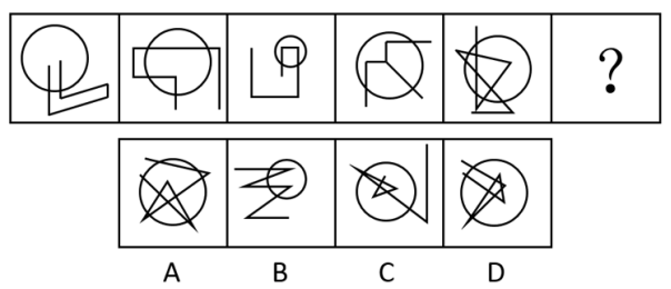 此題有機(jī)構(gòu)這么分析:元素組成不同考慮數(shù)量規(guī)律,第一組圖形交點(diǎn)數(shù)量依次為6、10、4,6+4=10;第二組圖形交點(diǎn)數(shù)依次為5、11、?,因此問號處填一個(gè)6個(gè)交點(diǎn)數(shù)的圖形,答案選A。嗯,等等,考慮對稱軸的話,選D好像也說得通啊。對,這題是爭議題!