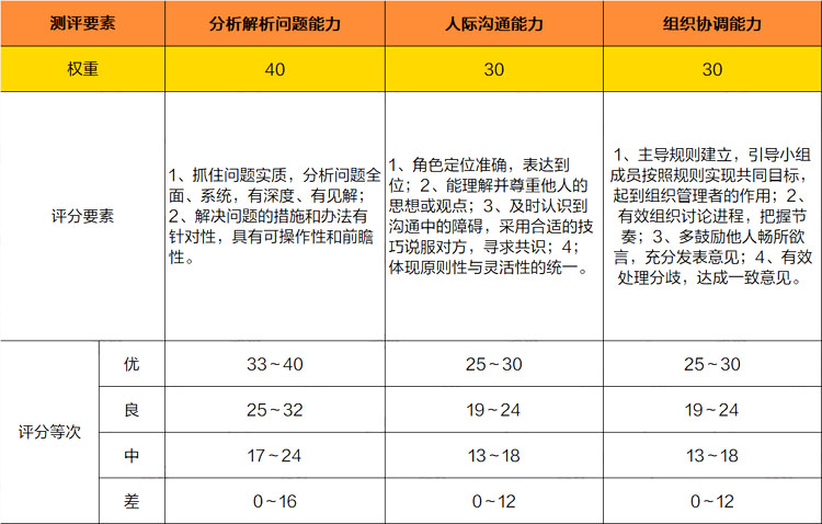 但近幾年常以無(wú)領(lǐng)導(dǎo)小組討論的面試形式,所以我們今天主要討論一下無(wú)領(lǐng)導(dǎo)小組面試的評(píng)分標(biāo)準(zhǔn)。無(wú)領(lǐng)導(dǎo)主要考察考生的各方面能力,和結(jié)構(gòu)化面試完全不同,它不是激烈的辯論,而是意見(jiàn)的交流討論;不是用氣勢(shì)壓人,而是用氣度服人;不是獨(dú)占鰲頭,而是群策群力引導(dǎo)指引。在這個(gè)基礎(chǔ)上,我們必須進(jìn)行準(zhǔn)備,才能有的放矢。