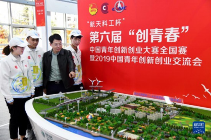 2019年11月1日,在山東青島舉行的第六屆“創(chuàng)青春”中國青年創(chuàng)新創(chuàng)業(yè)大賽全國賽暨2019中國青年創(chuàng)新創(chuàng)業(yè)交流會上,參會人員在給志愿者介紹新鄉(xiāng)村智慧能源服務(wù)模式。新華社記者李紫恒攝