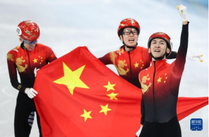 2月5日,中國隊選手武大靖(右一)在比賽后慶祝。在首都體育館舉行的北京2022年冬奧會短道速滑項目混合團體接力決賽中,中國隊奪得冠軍。新華社記者楊磊攝